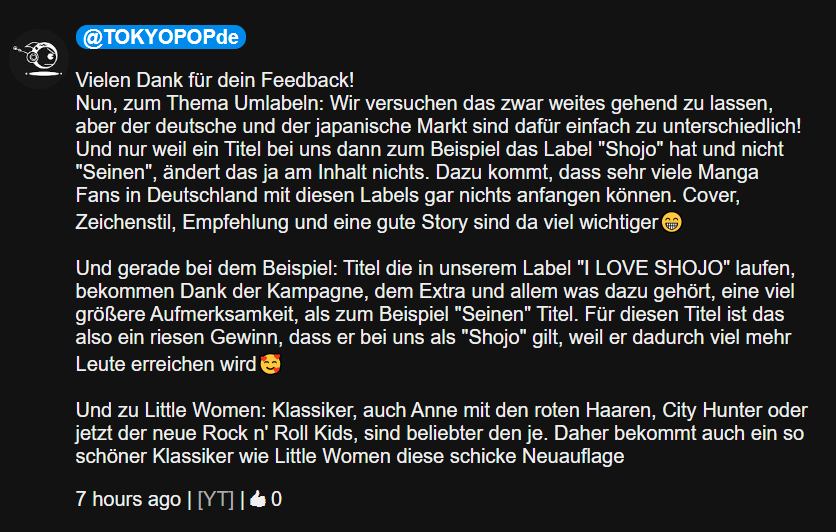 Was für ne blöde Antwort! Ein Seinen gewinnt also nur, wenn es als Shojo-Titel deklariert wird? Ist ja nicht so, als würden Seinen nicht so oder so genug Aufmerksamkeit bekommen.Währenddessen sind Shojos am Abnehmen, gerade wenn man all die Webtoon-Titel weglässt. Wenn deutsche Manga-Fans angeblich nichts mit Labeln anfangen können, dann braucht TP auch gar nicht erst ihre Programme in Demografien zu unterteilen.